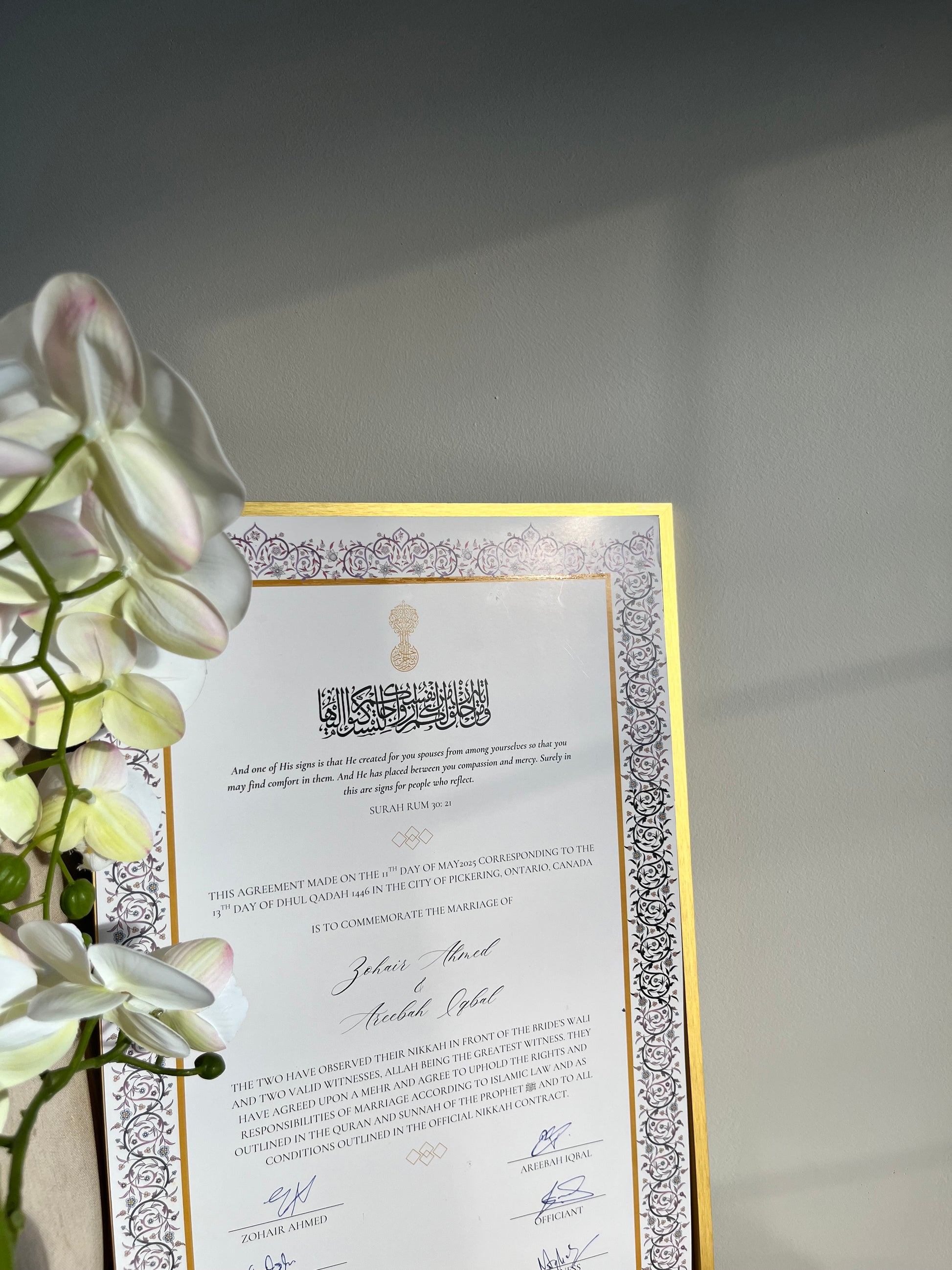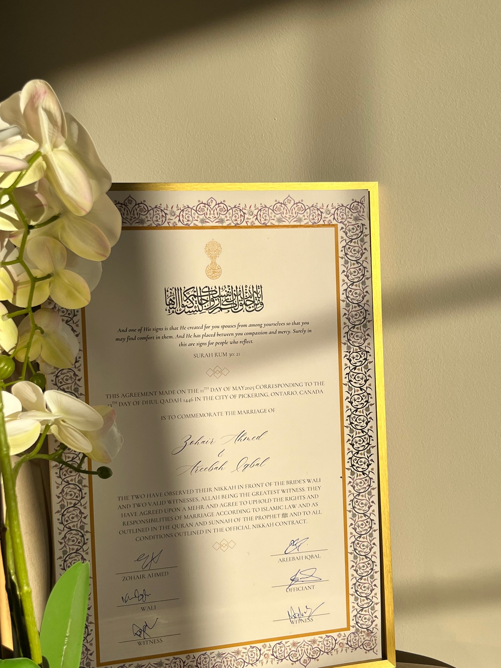 Mark the beginning of your forever with The Majestic Pledge — a stunning Nikah certificate designed to embody the strength, dignity, and beauty of your union. With its bold elegance and refined detailing, this piece is the perfect way to honor your sacred vows.