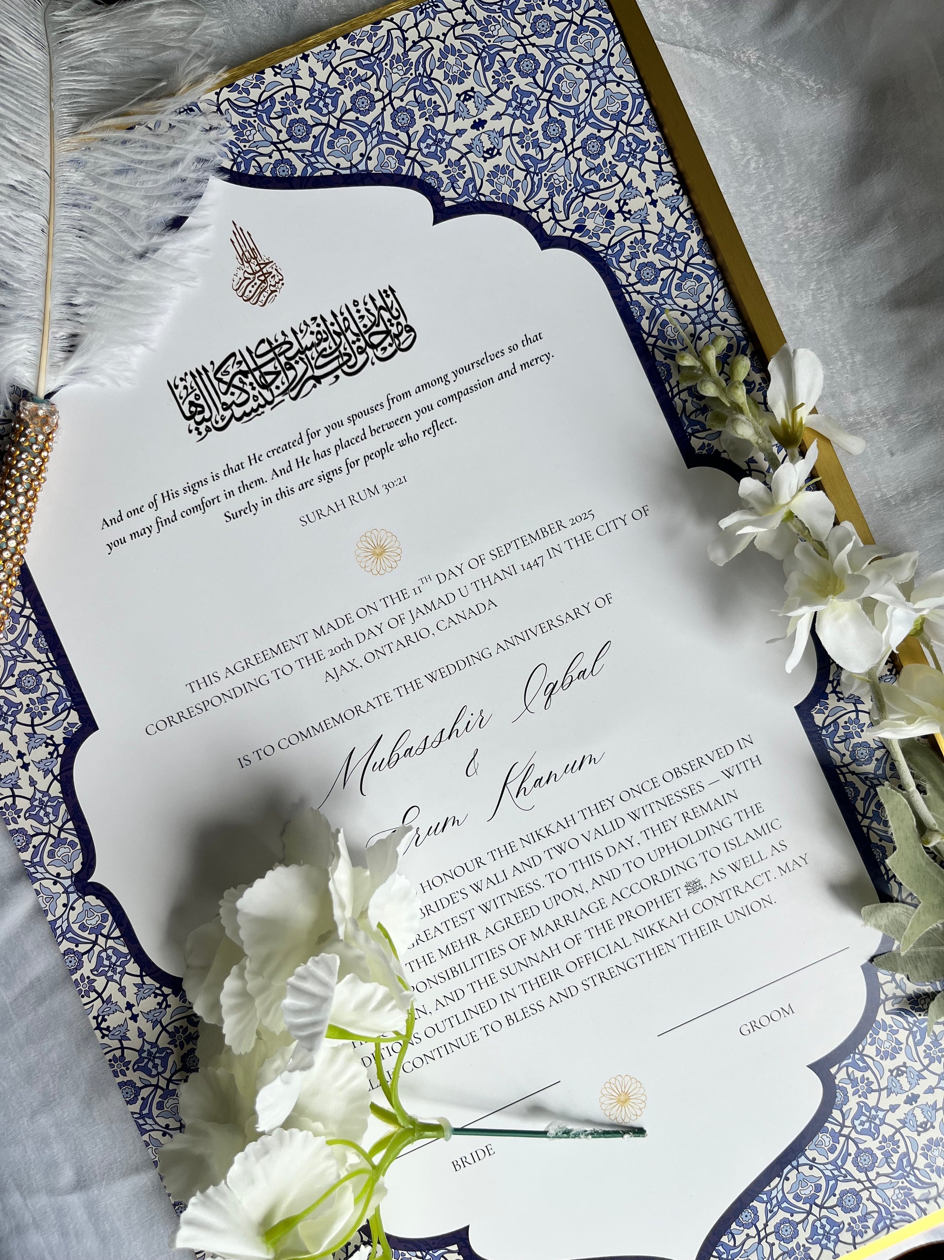 Celebrate your sacred union with The Sapphire Bond — a striking Nikah certificate inspired by the deep, unwavering nature of love. With cool, refined tones and elegant detailing, this design symbolizes trust, devotion, and a bond that stands the test of time.